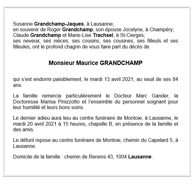 Maurice GRANDCHAMP 03 mai. 1937 - 13 avr. 2021 Avis mortuaire PFG Télecharger PDF Partager sur: Galerie PreviousNext PreviousNext