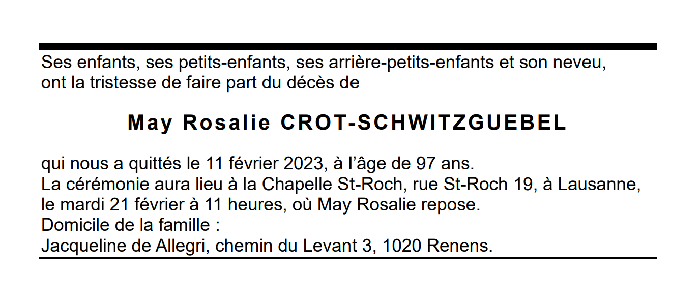 May Rosalie CROT-SCHWITZGUEBEL 07 jan. 1926 - 11 fév. 2023 Avis mortuaire PFG Télecharger PDF Partager sur: Galerie PreviousNext PreviousNext