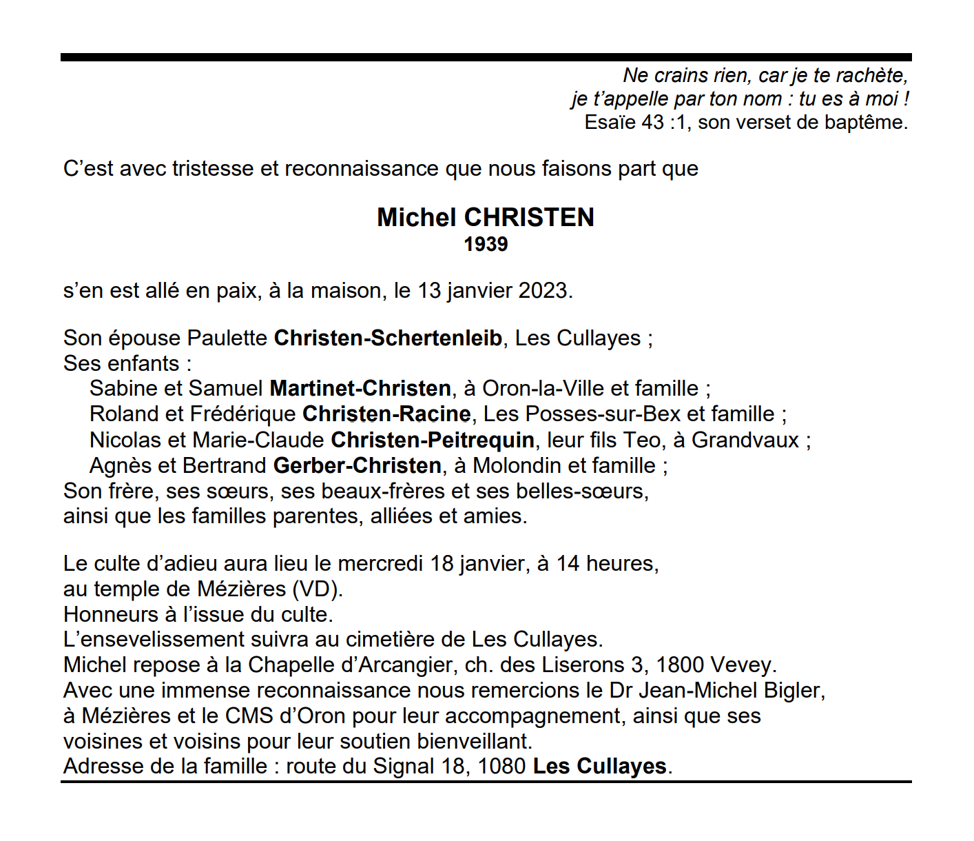 Michel CHRISTEN 07 mar. 1939 - 13 jan. 2023 Avis mortuaire PFG Télecharger PDF Partager sur: Galerie PreviousNext PreviousNext