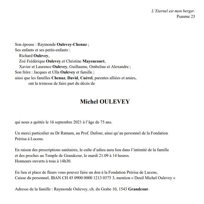 Michel OULEVEY 09 mar. 1946 - 16 sep. 2021 Avis mortuaire PFG Télecharger PDF Partager sur: Galerie PreviousNext PreviousNext