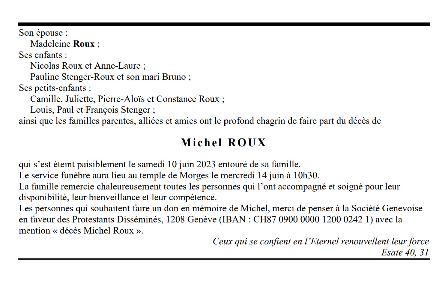 Michel ROUX 04 sep. 1928 - 10 juin. 2023 Avis mortuaire PFG Télecharger PDF Partager sur: Galerie PreviousNext PreviousNext