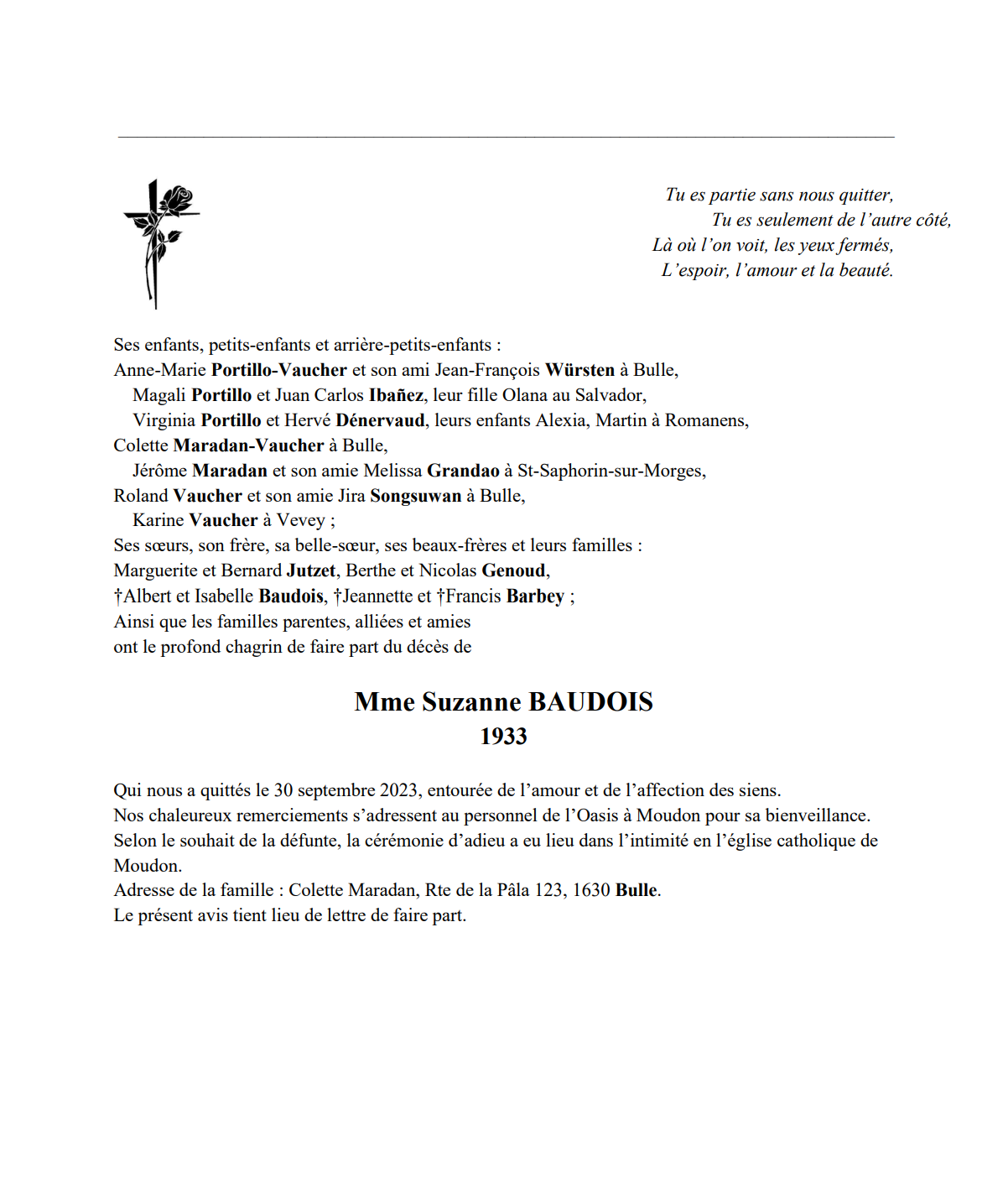 Mme Suzanne BAUDOIS 25 juil. 1933 - 30 sep. 2023 Avis mortuaire PFG Télecharger PDF Partager sur: Galerie PreviousNext PreviousNext