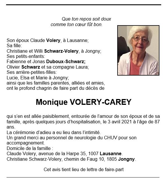 Monique VOLERY-CAREY 19 fév. 1934 - 03 avr. 2021 Avis mortuaire PFG Télecharger PDF Partager sur: Galerie PreviousNext PreviousNext