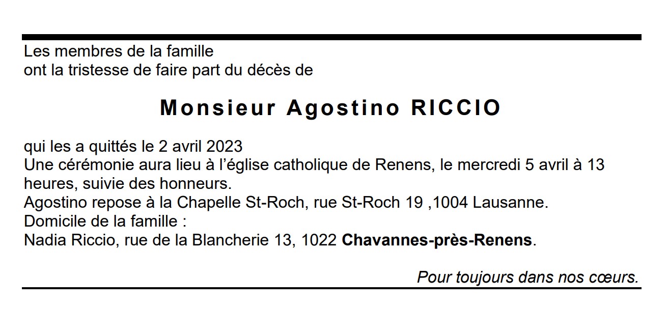 Monsieur Agostino RICCIO 08 sep. 1939 - 02 avr. 2023 Avis mortuaire PFG Télecharger PDF Partager sur: Galerie PreviousNext PreviousNext