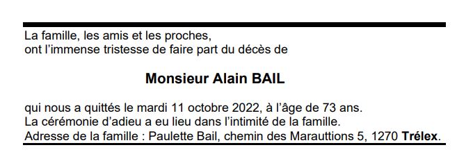 Monsieur Alain BAIL 08 aoû. 1949 - 11 oct. 2022 Avis mortuaire PFG Télecharger PDF Partager sur: Galerie PreviousNext PreviousNext