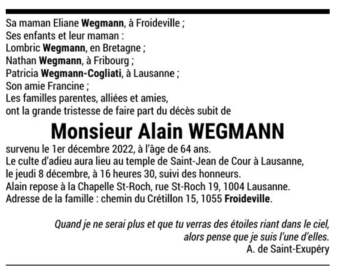 Monsieur Alain WEGMANN 17 mar. 1958 - 01 déc. 2022 Avis mortuaire PFG Télecharger PDF Partager sur: Galerie PreviousNext PreviousNext