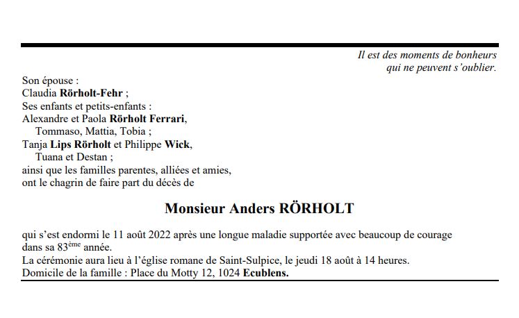 Monsieur Anders RÖRHOLT 26 avr. 0940 - 11 aoû. 2022 Avis mortuaire PFG Télecharger PDF Partager sur: Galerie PreviousNext PreviousNext