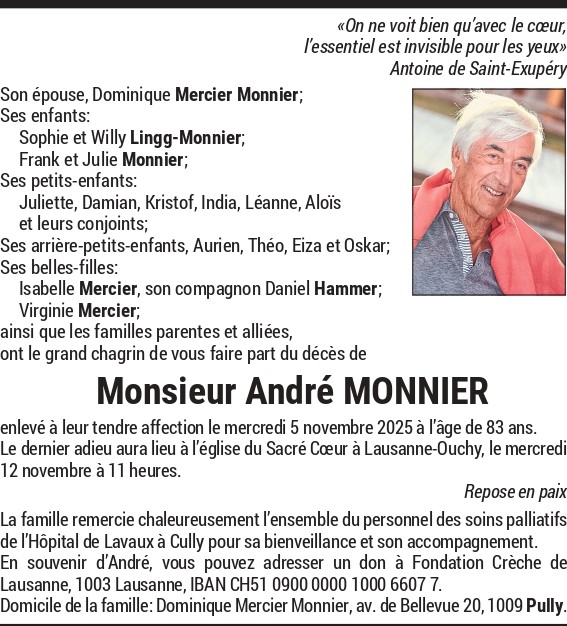 Monsieur André MONNIER 11 juin. 1942 - 05 nov. 2025 Avis mortuaire PFG Partager sur: Galerie PreviousNext PreviousNext