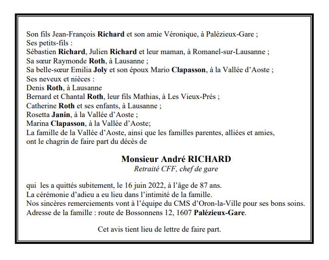 Monsieur André RICHARD 19 avr. 1935 - 16 juin. 2022 Avis mortuaire PFG Télecharger PDF Partager sur: Galerie PreviousNext PreviousNext