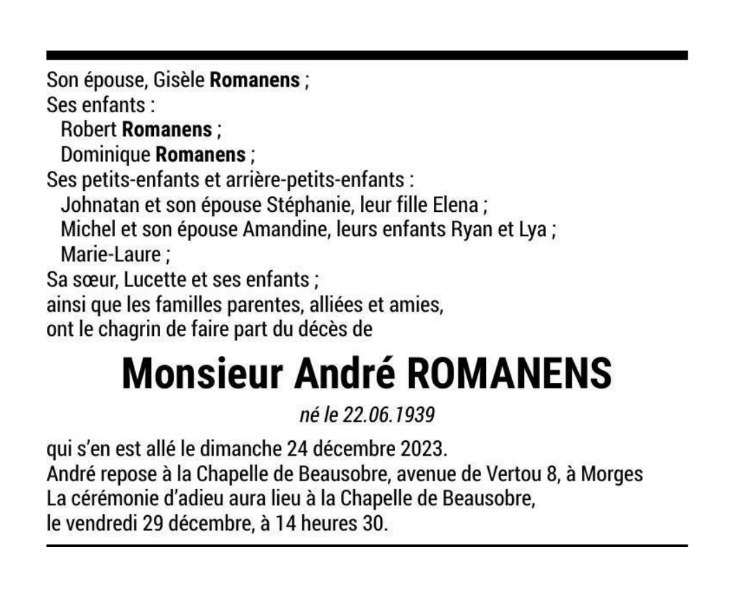 Monsieur André ROMANENS 22 juin. 1939 - 24 déc. 2023 Avis mortuaire PFG Télecharger PDF Partager sur: Galerie PreviousNext PreviousNext