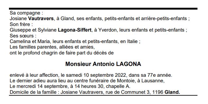 Monsieur Antonio LAGONA 25 nov. 1945 - 10 sep. 2022 Avis mortuaire PFG Télecharger PDF Partager sur: Galerie PreviousNext PreviousNext