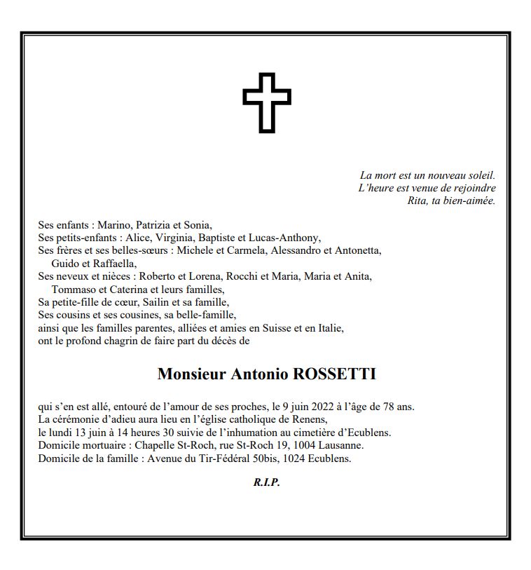 Monsieur Antonio ROSSETTI 30 mai. 1944 - 09 juin. 2022 Avis mortuaire PFG Télecharger PDF Partager sur: Galerie PreviousNext PreviousNext