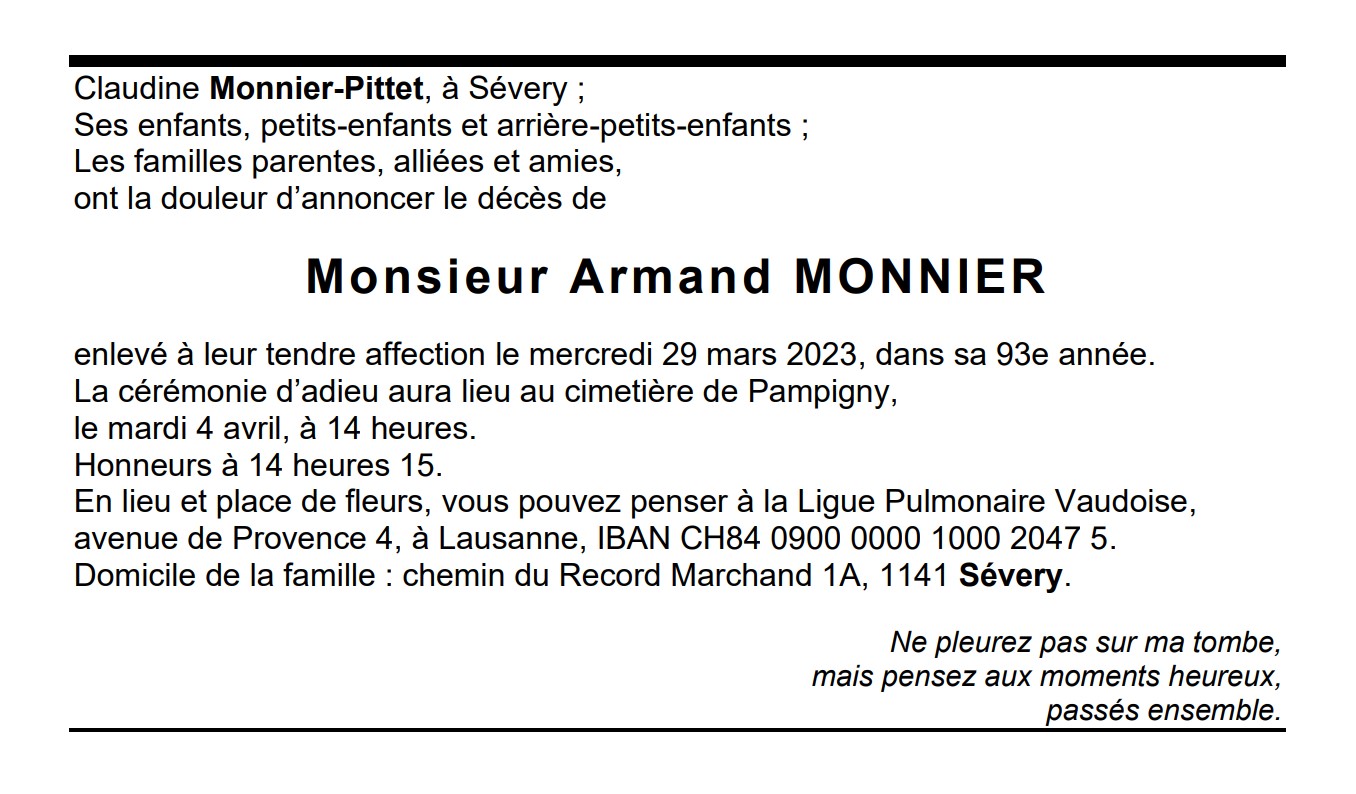 Monsieur Armand MONNIER 22 sep. 1930 - 29 mar. 2023 Avis mortuaire PFG Télecharger PDF Partager sur: Galerie PreviousNext PreviousNext