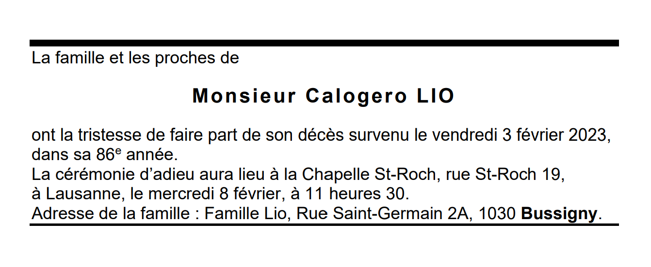 Monsieur Calogero LIO 06 mar. 1937 - 03 fév. 2023 Avis mortuaire PFG Télecharger PDF Partager sur: Galerie PreviousNext PreviousNext