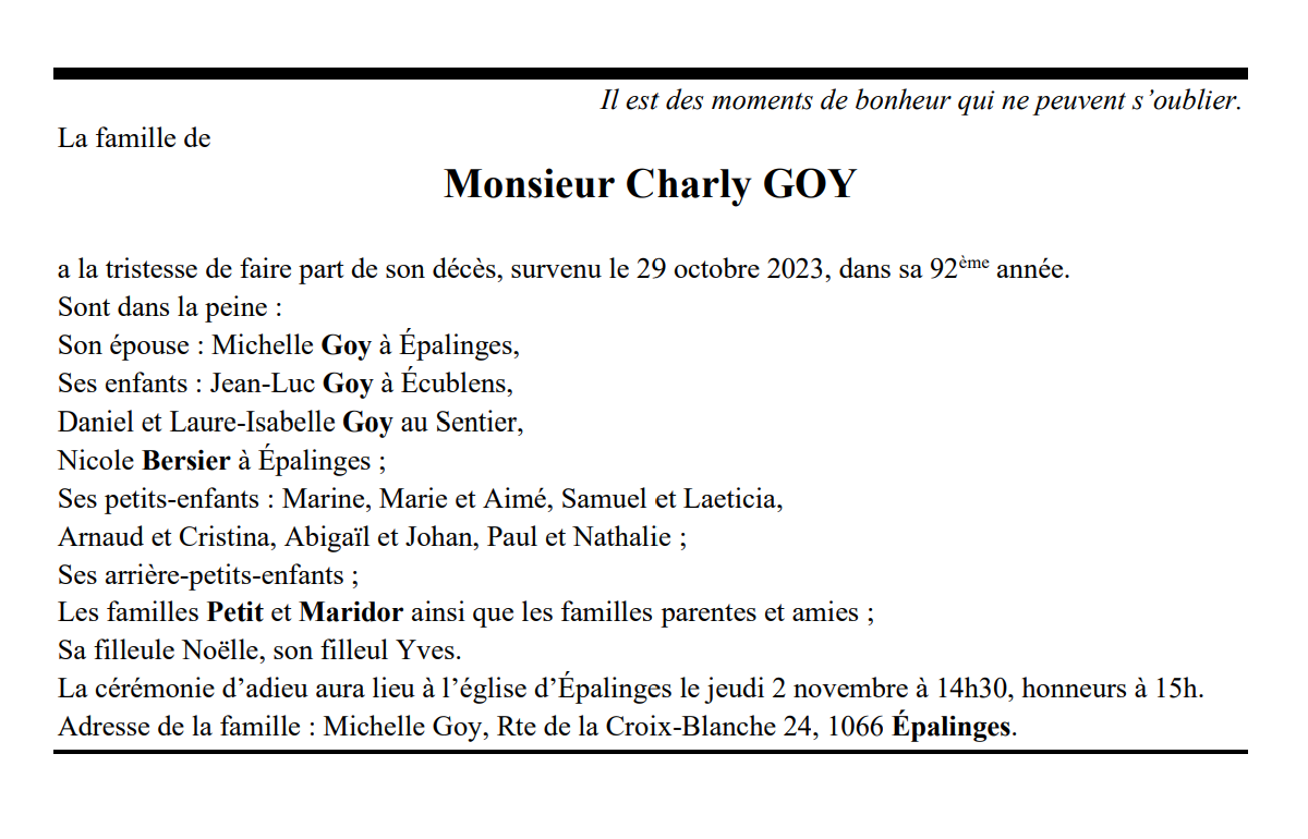 Monsieur Charly GOY 07 jan. 1932 - 29 oct. 2023 Avis mortuaire PFG Télecharger PDF Partager sur: Galerie PreviousNext PreviousNext