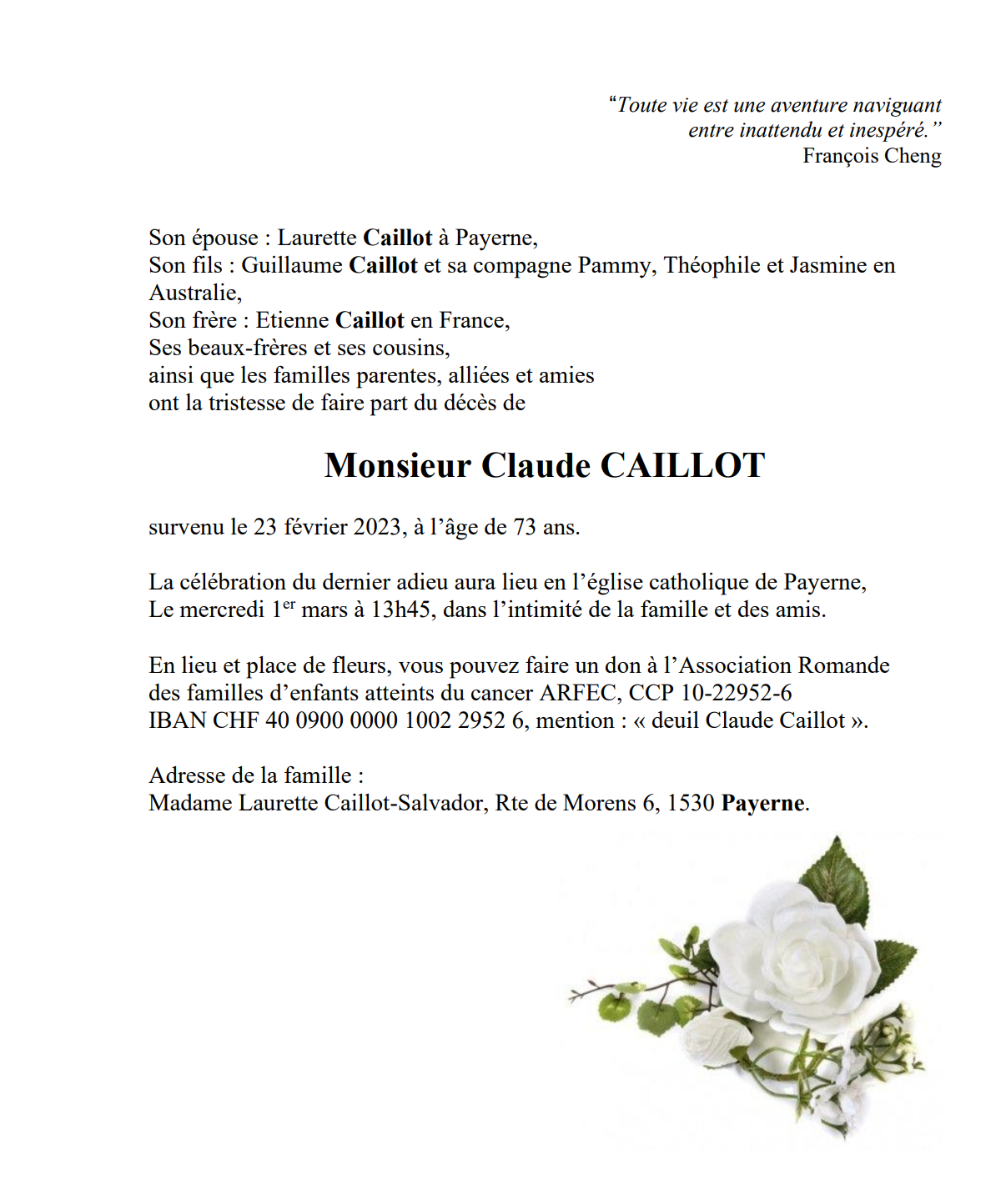 Monsieur Claude CAILLOT 02 déc. 1949 - 23 fév. 2023 Avis mortuaire PFG Télecharger PDF Partager sur: Galerie PreviousNext PreviousNext