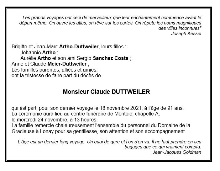 Monsieur Claude DUTTWEILER 15 mai. 1930 - 18 nov. 2021 Avis mortuaire PFG Télecharger PDF Partager sur: Galerie PreviousNext PreviousNext
