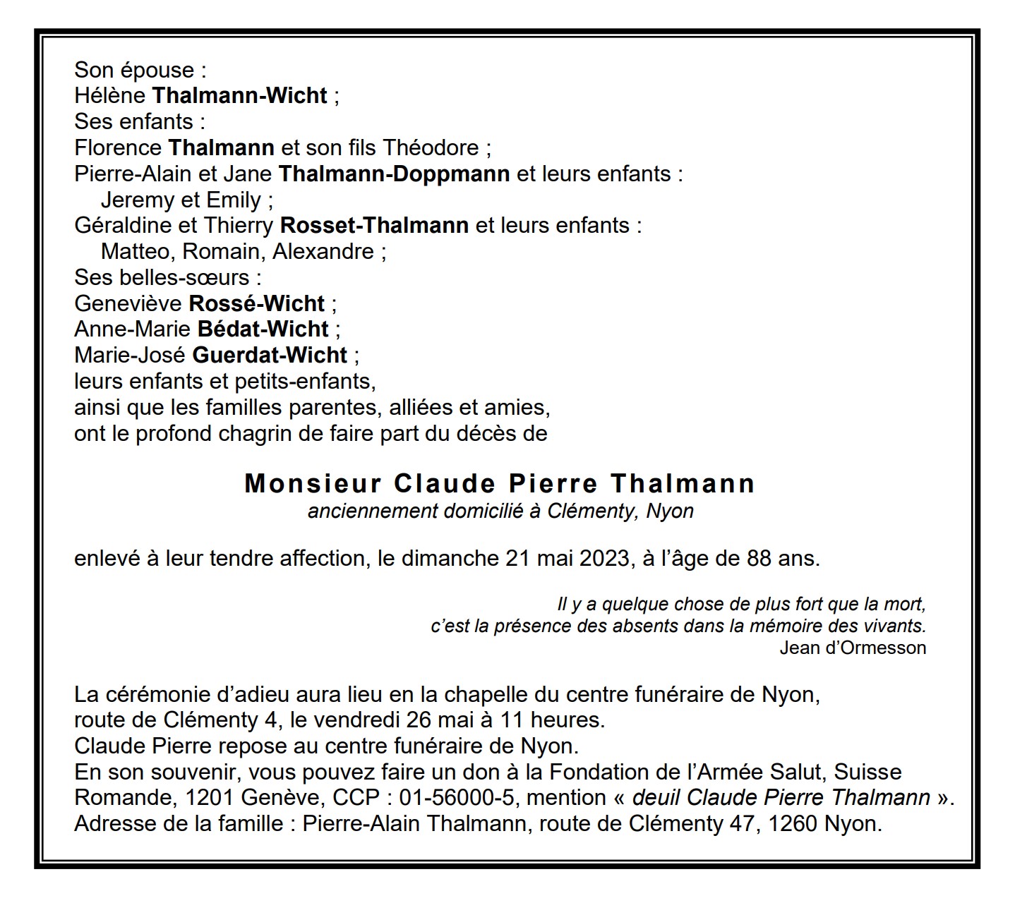 Monsieur Claude Pierre Thalmann anciennement domicilié à Clémenty, Nyon 08 aoû. 1934 - 21 mai. 2023 Avis mortuaire PFG Télecharger PDF Partager sur: Galerie PreviousNext PreviousNext