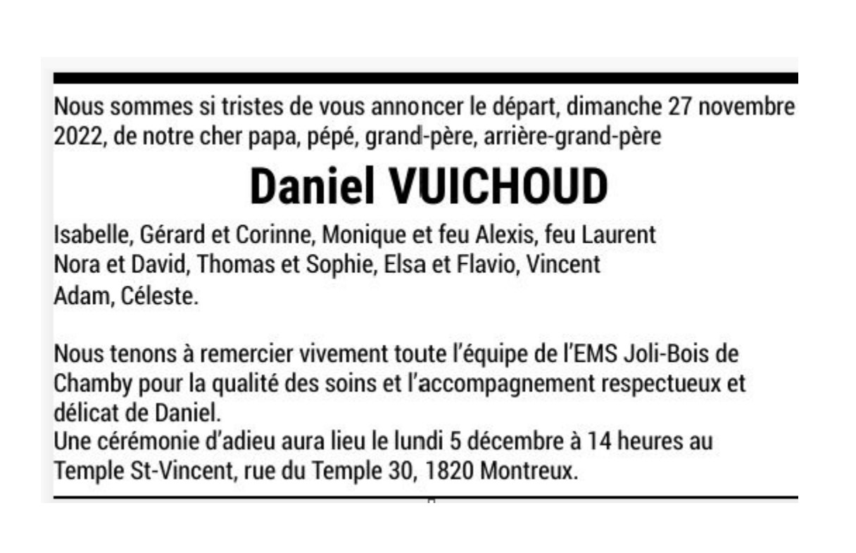 Monsieur Daniel VUICHOUD 29 sep. 1924 - 27 nov. 2022 Avis mortuaire PFG Télecharger PDF Partager sur: Galerie PreviousNext PreviousNext
