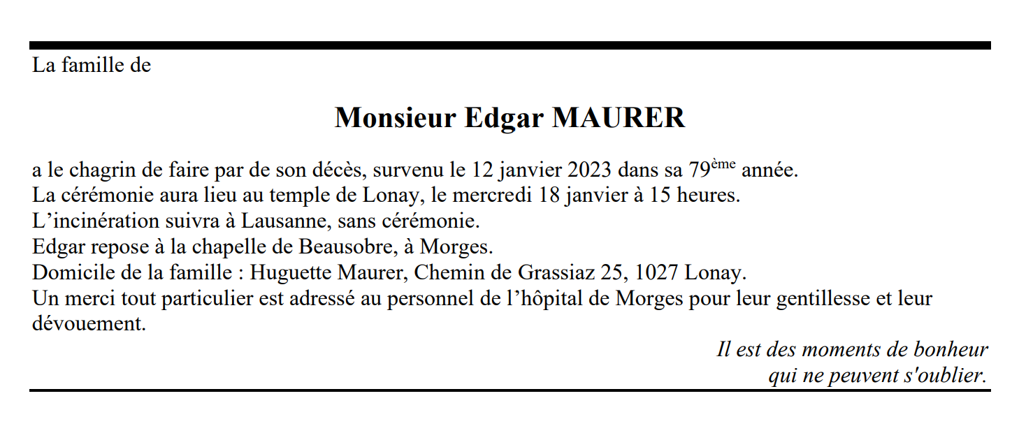 Monsieur Edgar MAURER 17 juil. 1944 - 12 jan. 2023 Avis mortuaire PFG Télecharger PDF Partager sur: Galerie PreviousNext PreviousNext