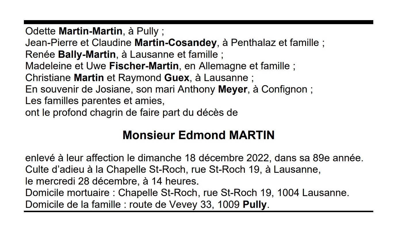 Monsieur Edmond MARTIN 04 jan. 1934 - 18 déc. 2022 Avis mortuaire PFG Télecharger PDF Partager sur: Galerie PreviousNext PreviousNext