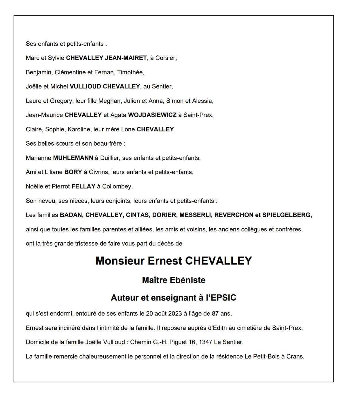 Monsieur Ernest CHEVALLEY Maître Ebéniste Auteur et enseignant à l’EPSIC 02 aoû. 1936 - 20 aoû. 2023 Avis mortuaire PFG Télecharger PDF Partager sur: Galerie PreviousNext PreviousNext