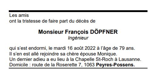 Monsieur François DÖPFNER 14 déc. 1942 - 16 aoû. 2022 Avis mortuaire PFG Télecharger PDF Partager sur: Galerie PreviousNext PreviousNext