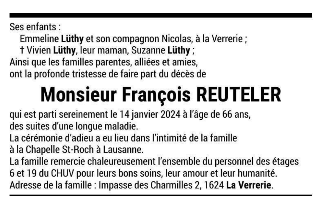 Monsieur François REUTELER 13 mar. 1957 - 14 jan. 2024 Avis mortuaire PFG Télecharger PDF Partager sur: Galerie PreviousNext PreviousNext