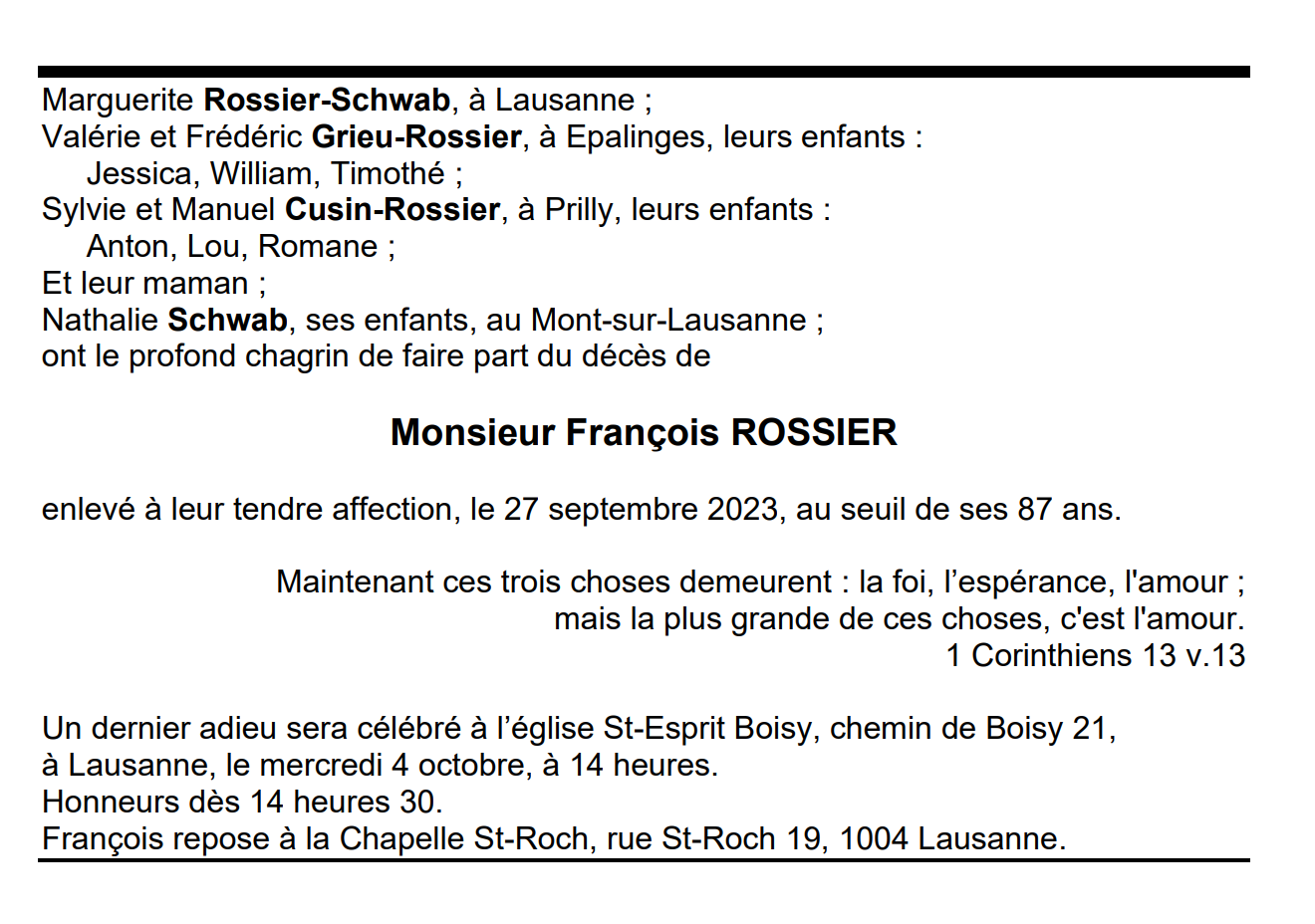 Monsieur François ROSSIER 28 oct. 1936 - 27 sep. 2023 Avis mortuaire PFG Télecharger PDF Partager sur: Galerie PreviousNext PreviousNext