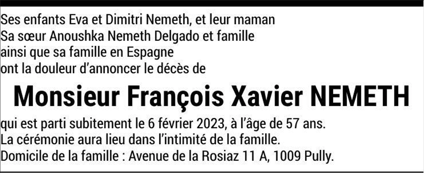 Monsieur François Xavier NEMETH 28 juil. 1965 - 06 fév. 2023 Avis mortuaire PFG Télecharger PDF Partager sur: Galerie PreviousNext PreviousNext
