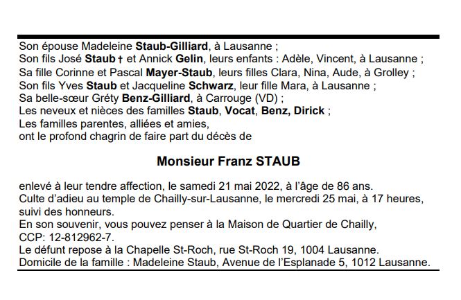 Monsieur Franz STAUB 16 mai. 1936 - 21 mai. 2022 Avis mortuaire PFG Télecharger PDF Partager sur: Galerie PreviousNext PreviousNext