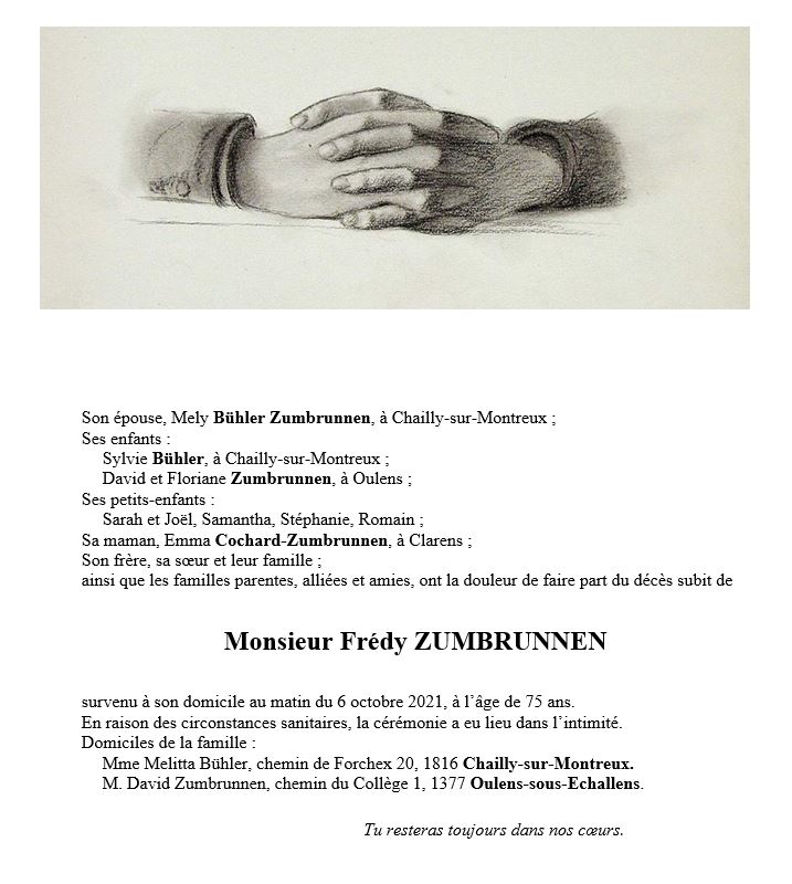 Monsieur Frédy ZUMBRUNNEN 30 jan. 1946 - 06 oct. 2021 Avis mortuaire PFG Télecharger PDF Partager sur: Galerie PreviousNext PreviousNext