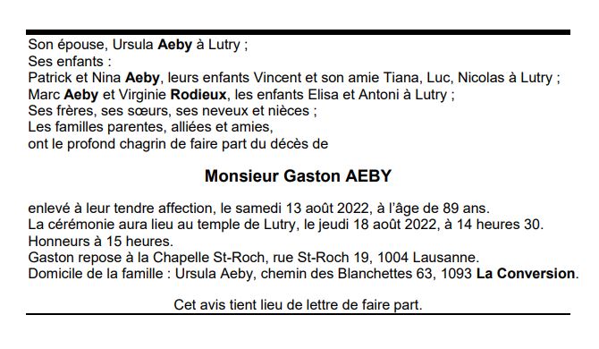 Monsieur Gaston AEBY 14 mar. 1934 - 13 aoû. 2022 Avis mortuaire PFG Télecharger PDF Partager sur: Galerie PreviousNext PreviousNext