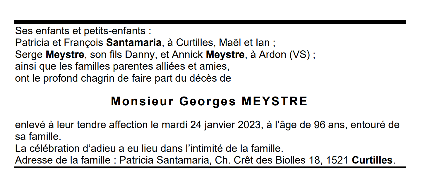 Monsieur Georges MEYSTRE 26 oct. 1927 - 24 jan. 2023 Avis mortuaire PFG Télecharger PDF Partager sur: Galerie PreviousNext PreviousNext