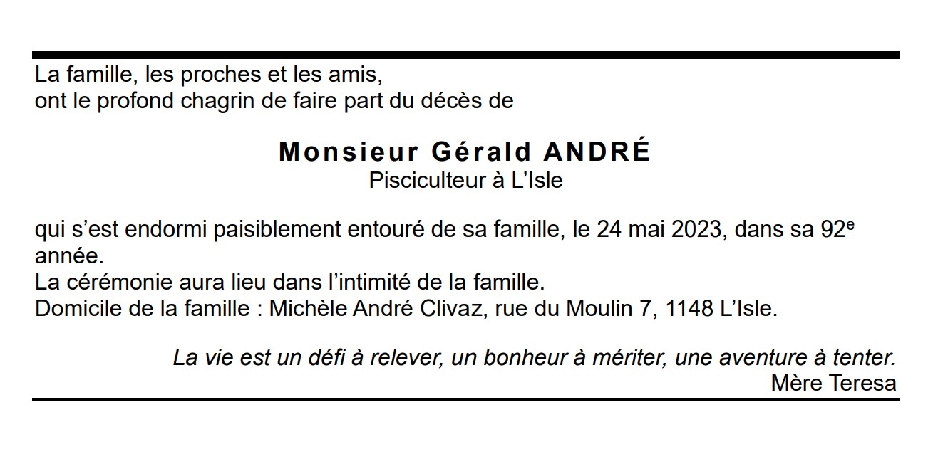 Monsieur Gérald ANDRÉ Pisciculteur à L’Isle 08 déc. 1931 - 24 mai. 2023 Avis mortuaire PFG Télecharger PDF Partager sur: Galerie PreviousNext PreviousNext