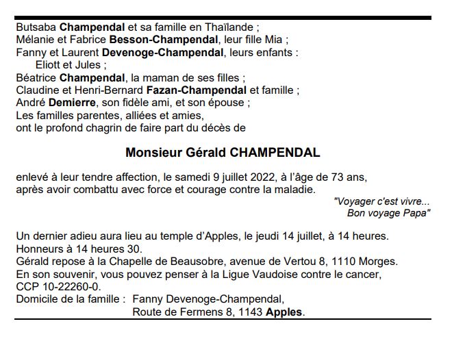 Monsieur Gérald CHAMPENDAL 23 nov. 1948 - 09 juil. 2022 Avis mortuaire PFG Télecharger PDF Partager sur: Galerie PreviousNext PreviousNext