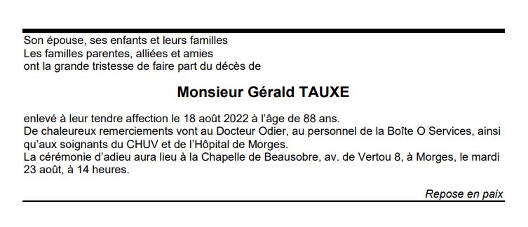 Monsieur Gérald TAUXE 12 avr. 1934 - 18 aoû. 2022 Avis mortuaire PFG Télecharger PDF Partager sur: Galerie PreviousNext PreviousNext