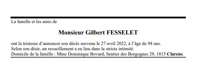 Monsieur Gilbert FESSELET 16 avr. 1928 - 27 avr. 2022 Avis mortuaire PFG Télecharger PDF Partager sur: Galerie PreviousNext PreviousNext