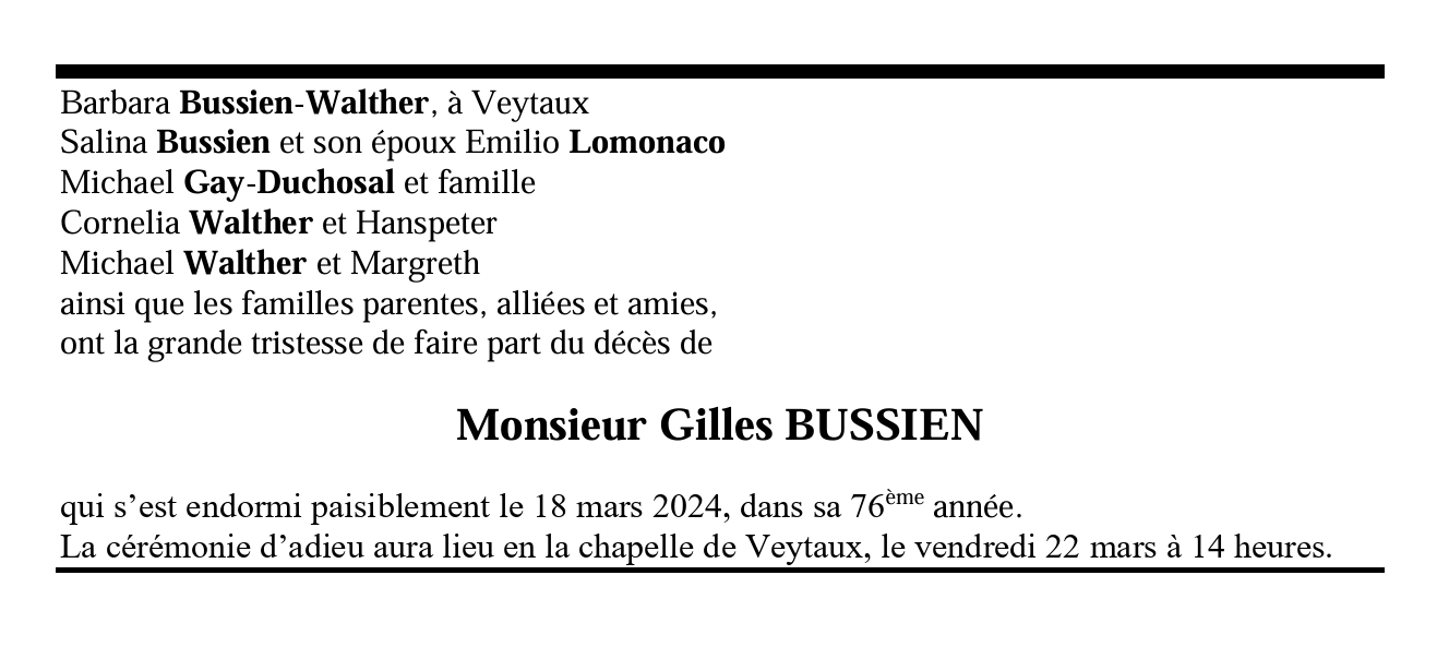 Monsieur Gilles BUSSIEN 24 sep. 1948 - 18 mar. 2024 Avis mortuaire PFG Télecharger PDF Partager sur: Galerie PreviousNext PreviousNext