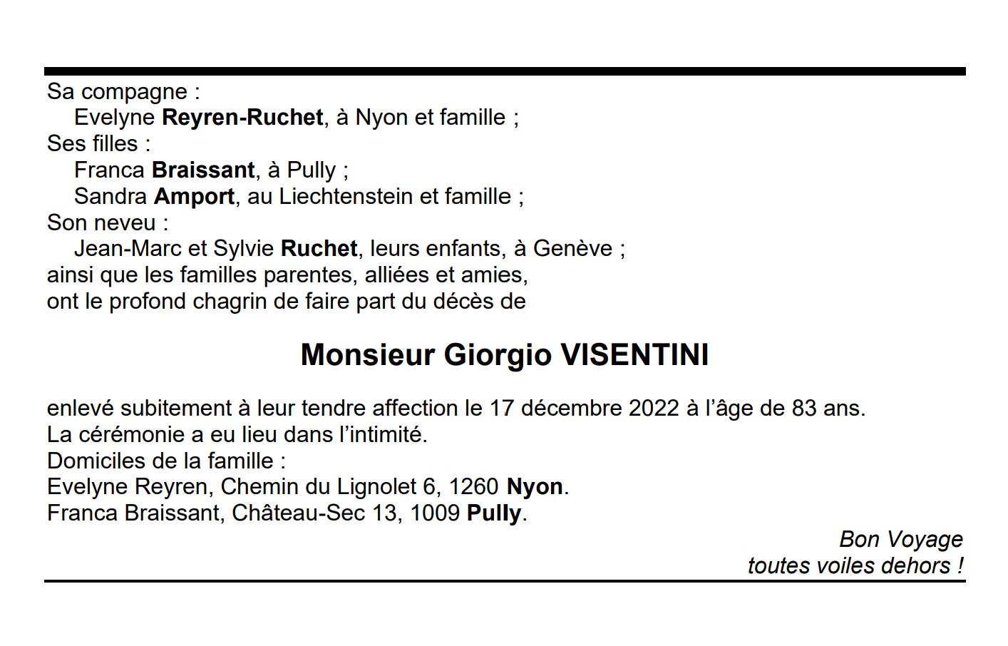 Monsieur Giorgio VISENTINI 17 aoû. 1939 - 17 déc. 2022 Avis mortuaire PFG Télecharger PDF Partager sur: Galerie PreviousNext PreviousNext