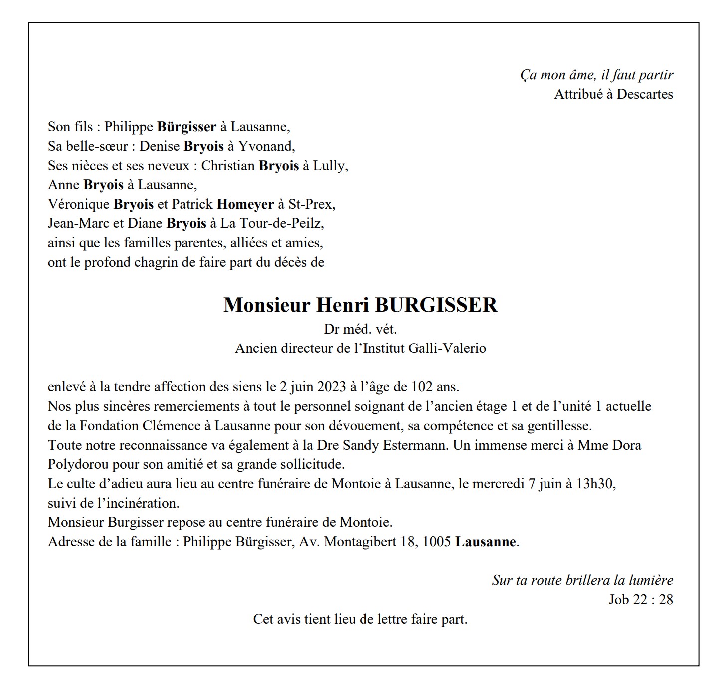 Monsieur Henri BURGISSER Dr méd. vét. Ancien directeur de l’Institut Galli-Valerio