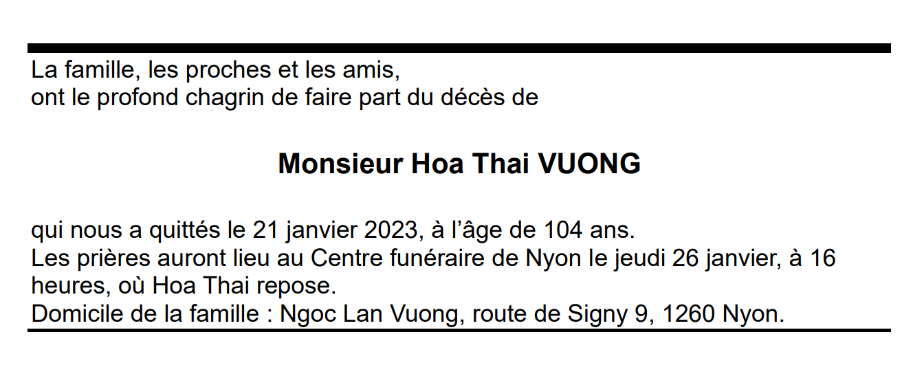 Monsieur Hoa Thai VUONG 01 jan. 1919 - 21 jan. 2023 Avis mortuaire PFG Télecharger PDF Partager sur: Galerie PreviousNext PreviousNext