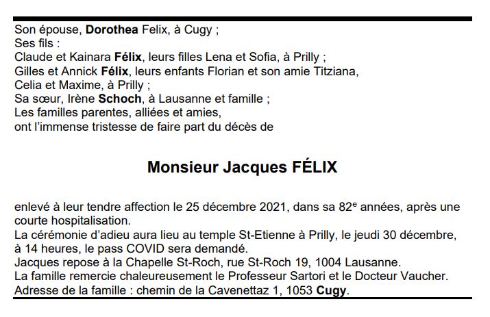Monsieur Jacques FÉLIX 09 juil. 1940 - 25 déc. 2021 Avis mortuaire PFG Télecharger PDF Partager sur: Galerie PreviousNext PreviousNext