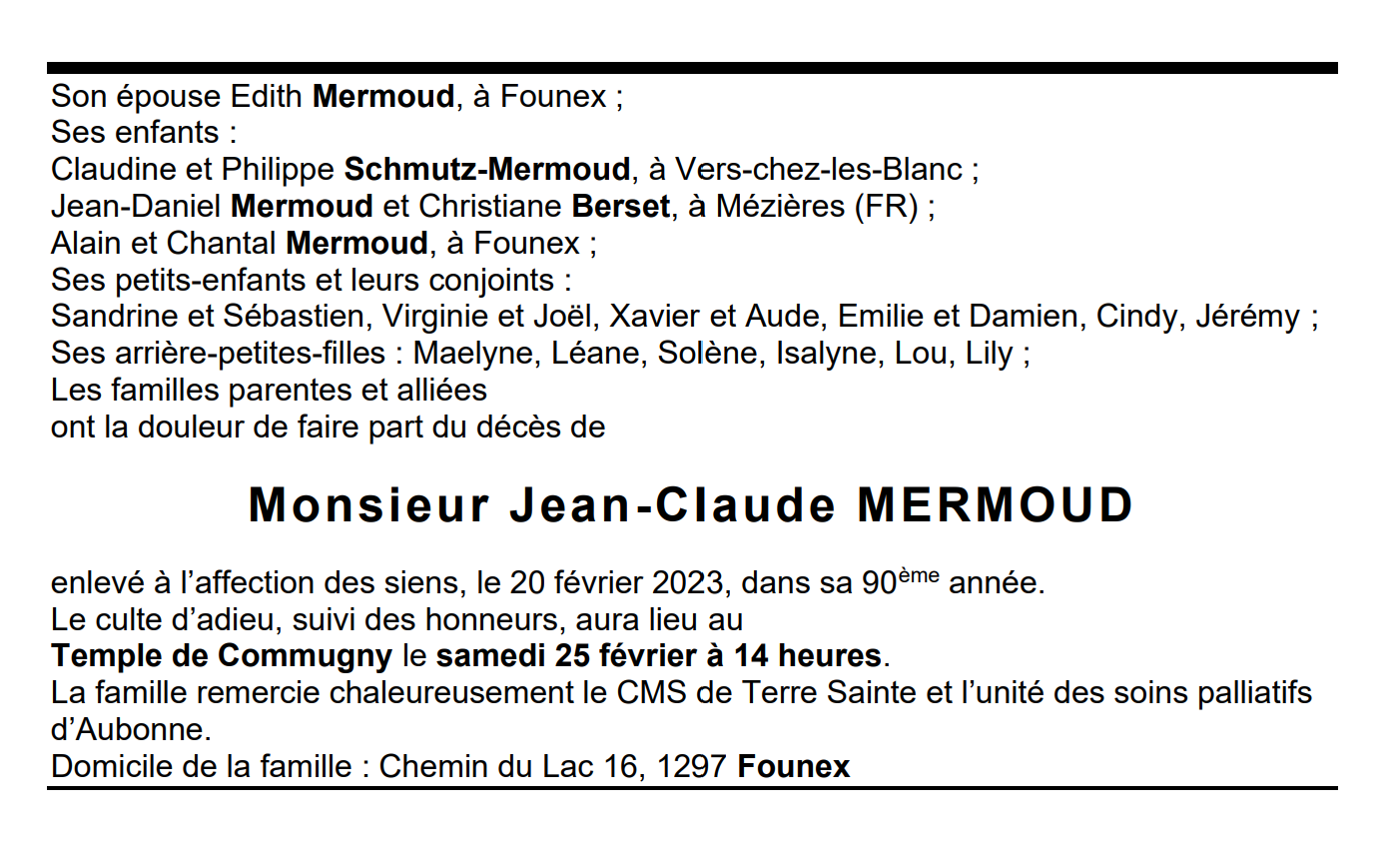 Monsieur Jean-Claude MERMOUD 24 nov. 1933 - 20 fév. 2023 Avis mortuaire PFG Télecharger PDF Partager sur: Galerie PreviousNext PreviousNext