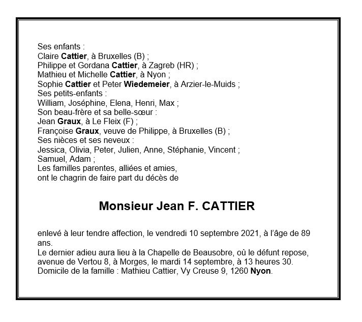 Monsieur Jean F. CATTIER 24 aoû. 1938 - 10 sep. 2021 Avis mortuaire PFG Télecharger PDF Partager sur: Galerie PreviousNext PreviousNext