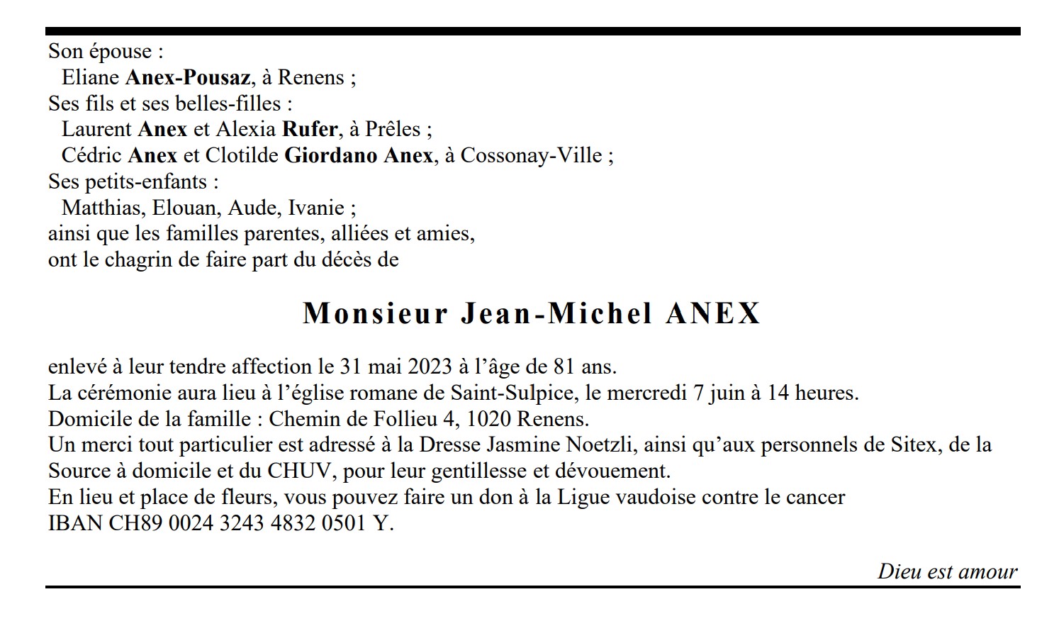Monsieur Jean-Michel ANEX 25 fév. 1942 - 31 mai. 2023 Avis mortuaire PFG Télecharger PDF Partager sur: Galerie PreviousNext PreviousNext