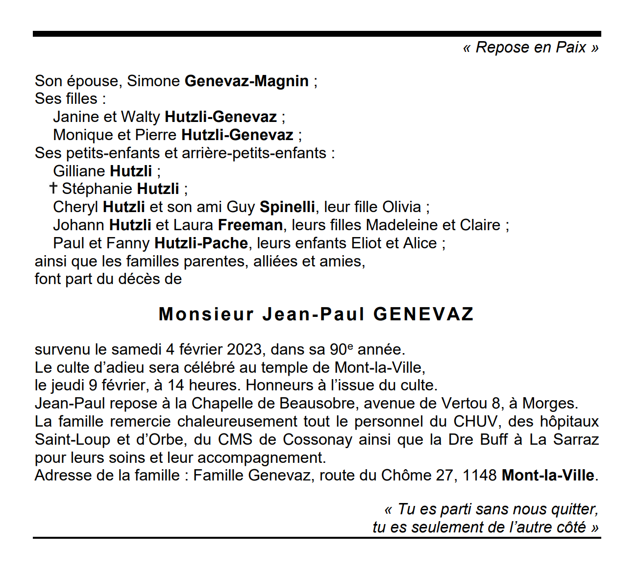 Monsieur Jean-Paul GENEVAZ 02 déc. 1933 - 04 fév. 2023 Avis mortuaire PFG Télecharger PDF Partager sur: Galerie PreviousNext PreviousNext