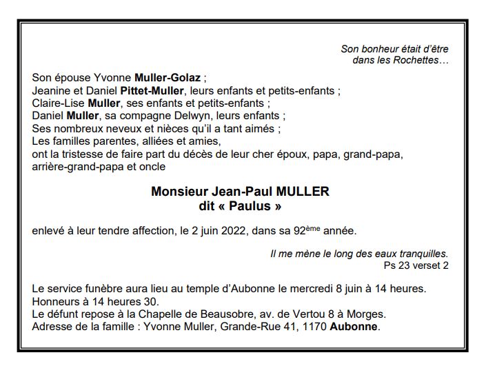 Monsieur Jean-Paul MULLER 21 déc. 1930 - 02 juin. 2022 Avis mortuaire PFG Télecharger PDF Partager sur: Galerie PreviousNext PreviousNext