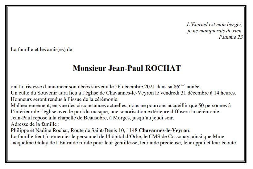 Monsieur Jean-Paul ROCHAT 06 fév. 1936 - 26 déc. 2021 Avis mortuaire PFG Télecharger PDF Partager sur: Galerie PreviousNext PreviousNext