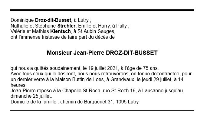 Monsieur Jean-Pierre DROZ-DIT-BUSSET 02 mar. 1946 - 19 juil. 2021 Avis mortuaire PFG Télecharger PDF Partager sur: Galerie PreviousNext PreviousNext